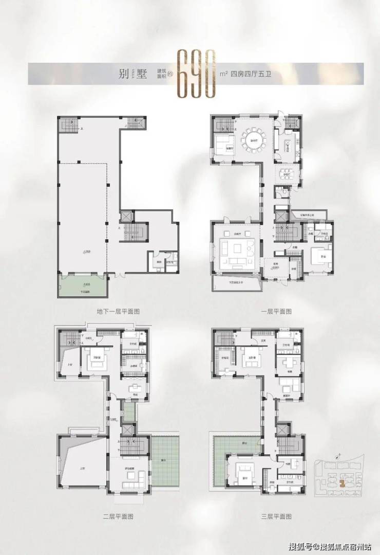 别墅户型从400㎡到694㎡不等(仅备注地上建筑面积,另有地下室面积附送)