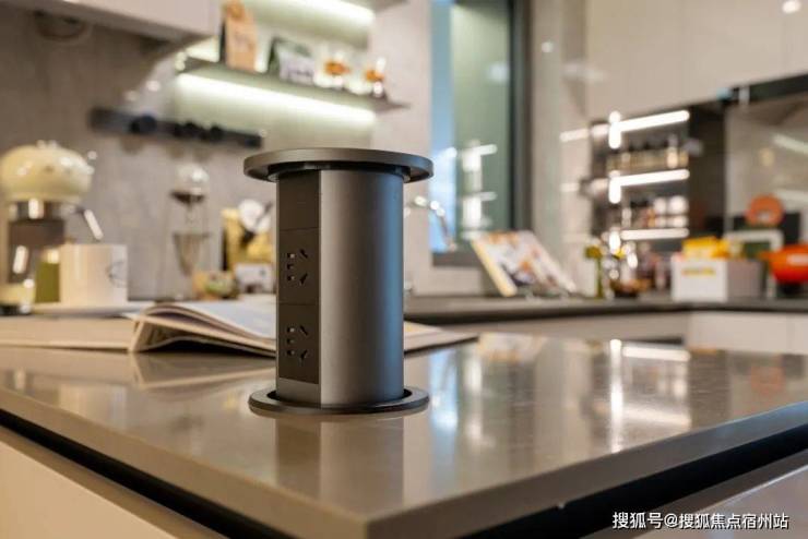 仔细看,厨房的岛台上还放置了一个升降插座!现在看让人眼前一亮,而未来的生活你会深深感受到它有多么实用!