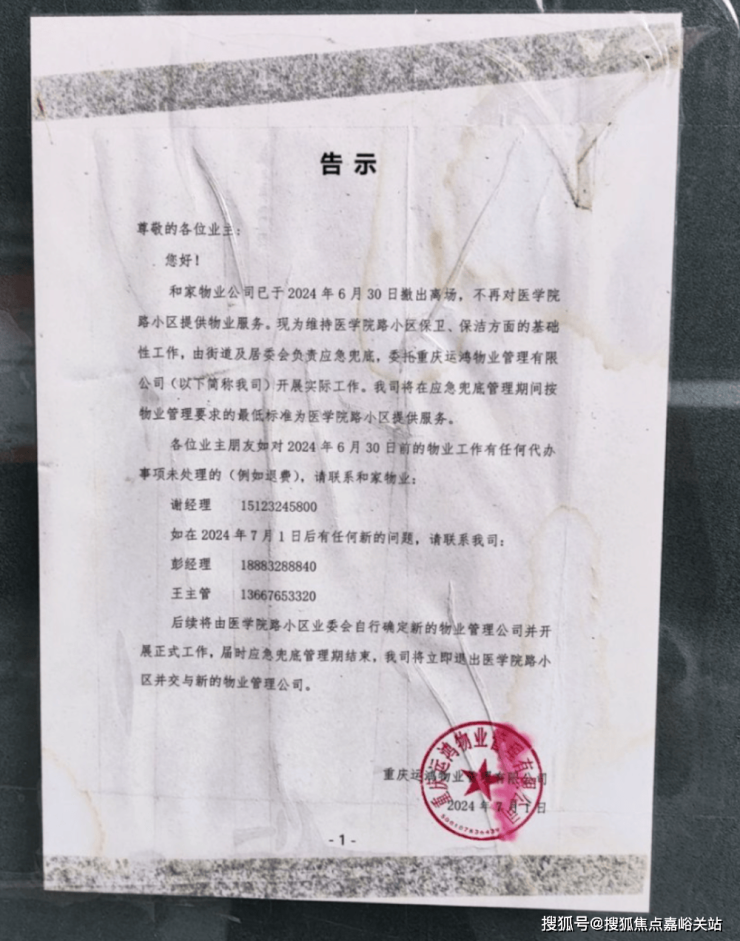 为时6个月的应急管理期后,小区仍未找到接手的物业公司,运鸿物业于是贴出通告: