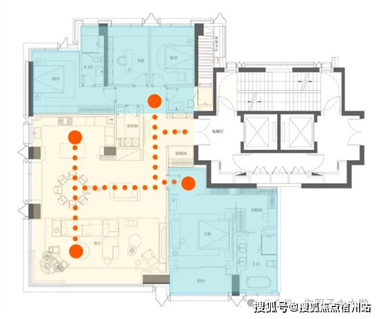 ②玄关进来分左右动线, 动静分区明确,北区是次卧区,南侧是主卧区, 保证代际居住相对独立。