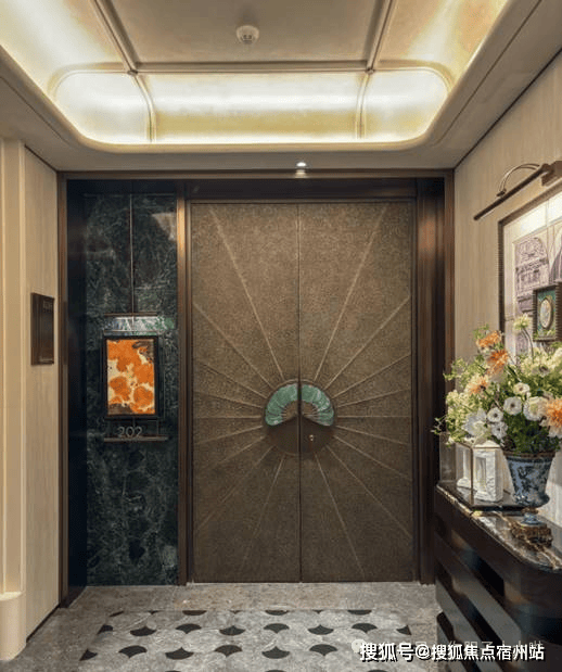 专属电梯厅归家,独立方正,极具 私密性。开启属于自己的入户序章。已开户型均配备了 铸铝装甲门,门把手为内嵌奢石的 扇形设计, 整体海派元素贯穿项目,密码锁也巧妙隐藏于扇面造型之后,当人手靠近,支持感应开启。 天花都用了肌理漆,简约却设计感十足。