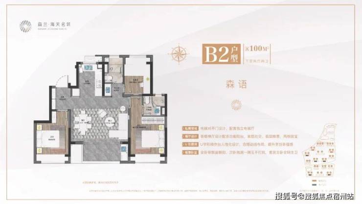 1、建面约100㎡三房两厅两卫,市场主流户型。客餐横厅设计配多功能阳台,优势在于更大采光面和更好通风效果,把过道纳入到客厅和餐厅的空间中来,使整体空间得到更好的利用。