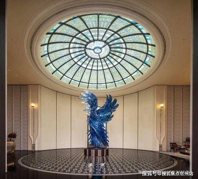 彩绘玻璃穹顶漫射柔和天光,艺术拱门与浮雕墙面交替排列,✅✅建发·海宸售楼处电话:400 - 8824 - 258✅✅中央紫蓝渐变花艺装置描摹四季流转之美,可上演私享音乐会、业主演说会、亲子读书会、浪漫下午茶等,复现百年和平饭店的顶层社交场景。