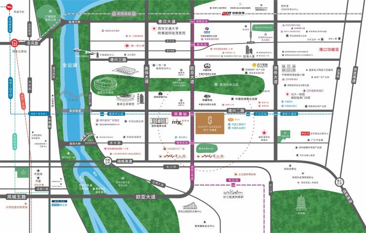 地铁3/14号线无缝对接、奥体大道、欧亚大道,串联大雁塔、曲江、高新、小寨,通达全城。