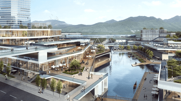 永安渠商业街占地约380.4亩,由12个商业设施地块组成,其中地上建筑面积约51万㎡,地下一层商业及配套建筑面积约20万平方米,全贯通的地下空间主要用于停车、配套及设备用房等,同时规划有多维地下环路,实现与周边商务等建筑的互联互通。永安渠创意水景贯穿中轴,构成独一无二的滨水商业街景。