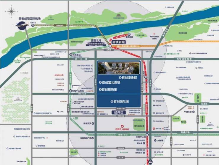 【交通】项目距西安北站5分钟,距市委市政府8分钟,距熙地港、大融城10分钟,距机场15分钟;地铁2号线北苑站出门即达;向北一站达高铁北站,连接14号线;向南两站达行政中心,连接4号线。