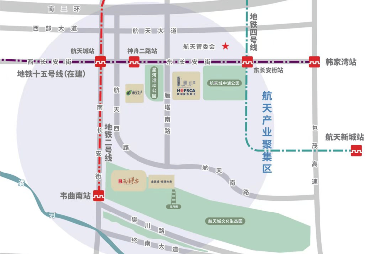 项目位于雁塔南路与航创路交汇处,紧邻地铁15号线(建设中),直通大学城、高新区,距离地铁15号线神舟二路站步行约5分钟。侧邻地铁2、4号线,贯穿城南城北。东长安街、雁塔南路,双主干道加持,立体交通畅达全城。