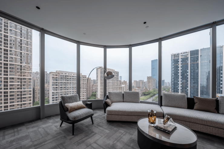 交付标准:穿孔铝板吊顶,有效吸音降噪;墙面乳胶漆;电动窗帘;地面架空地台130mm;(另可提供标准装修、定制装修);