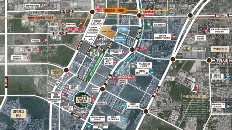 TOP轨交线:三轨道聚集,多维立体路网环伺。项目接驳地铁6号线仁村站约600米,现已正式运营,地铁15号线祝村站(在建)约400米,高新云轨能源站(在建)约400米,以及西安南站(在建)等线路,同步城市繁华,悦享时代速度。