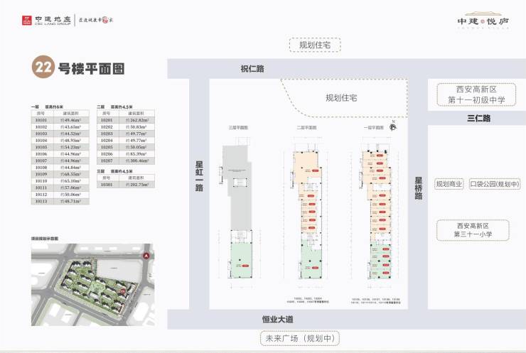 商铺面积:一层29-70平,二层49-300平,三层202平