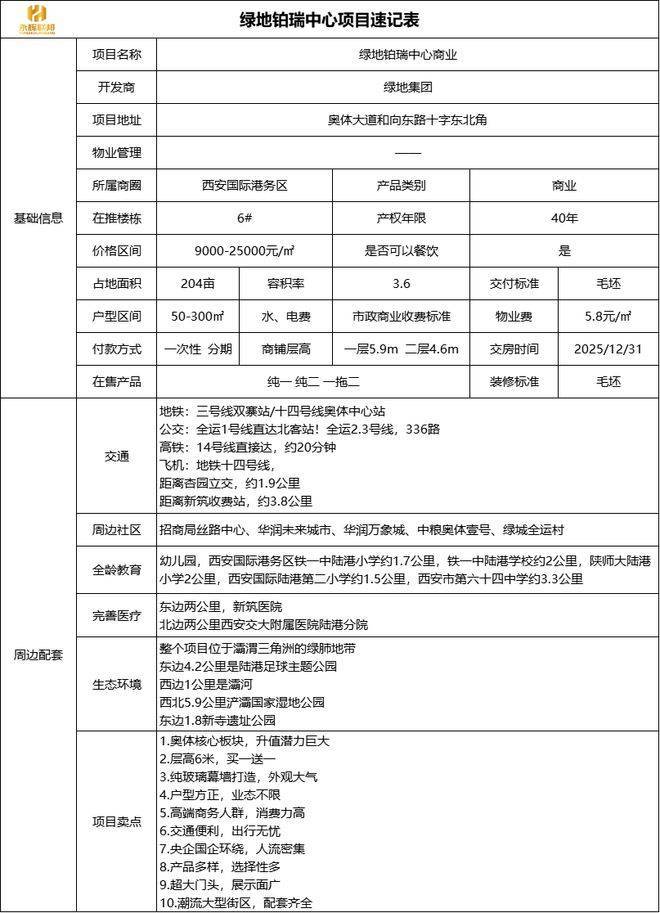 绿地铂瑞中心项目,分为南北两个地块,北地块为绿地铂瑞文化中心,占地面积约98亩。南地块为绿地(西安)全球商品贸易港,占地面积约106亩,南地块已经全部售罄。目前在售的地块为北地块的写字楼和公寓底商,此地块总建面31.6万方,业态涵盖超高层5A甲级写字楼和精品公寓,商业街区。