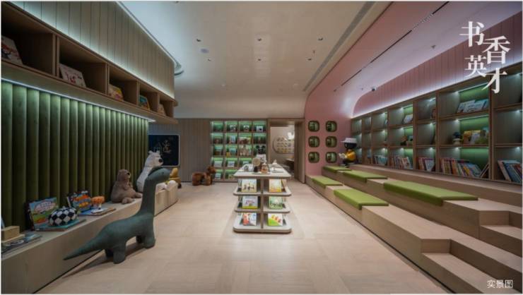 【阅读坊·书香英才】通过温暖的空间配色、阶梯式设计阅读IP雕塑、乐高主题吊灯等,打造一个共享知识与乐趣的温馨角落。