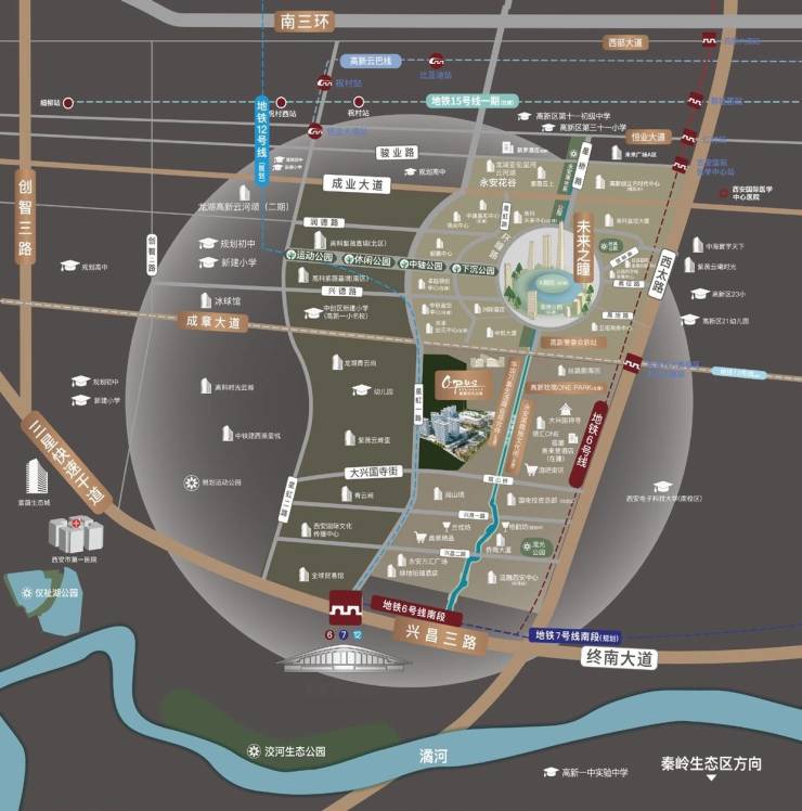 “未来之瞳——瞳系列建筑集群”:以大剧院为核心,拥有约450亩湿地公园、瞳系列建筑集群,配套科技中心、艺术家酒店、音乐厅、美术馆、城市展厅、西安国际文化传播中心等。