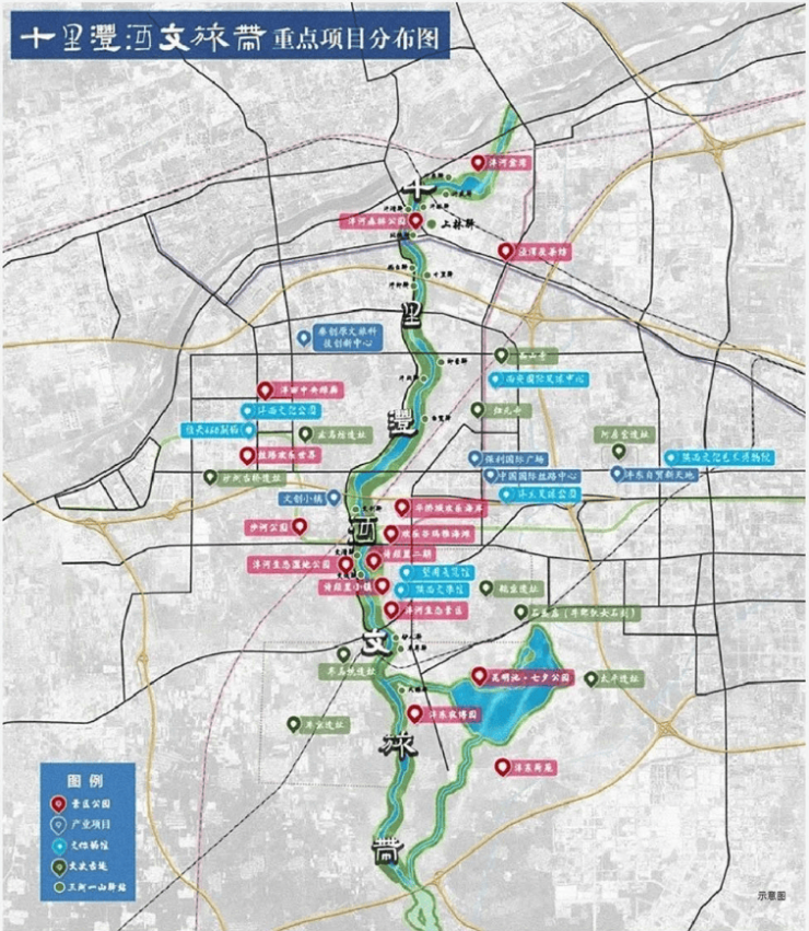 项目所在沣河沿线拥有丰镐京遗址、阿房宫遗址、沙河古桥遗址等12处重点历史遗存:拥有26.6公里沣河和10.4平方公里昆明池水资源:聚集了欢乐谷、诗经里等各类文旅项目42个。