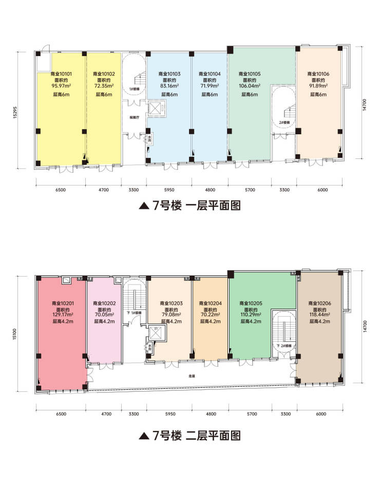 首层层高多数为6米(纯一楼层高4.5m-6m,二楼约4.5m)可隔二层,满足多种业态的经营需求,如零售的仓库、理发店二楼的美容、咖啡店二楼的小包房等,提高经营面积与功能的复合性,买一得二。