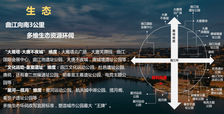 项目临近曲江核心生态地标,大雁塔(约4km)、曲江池遗址公园(约4km)、大唐芙蓉园(约4km),约3km内包含曲江文化运动公园、世子公园、清凉山森林公园、中湖公园等,距大型文化遗址揽月阁约5km。