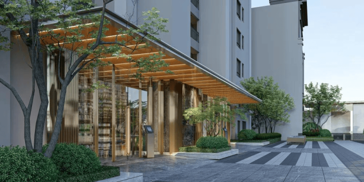汲取现代人居美学底蕴,项目打造新中式风格外立面,大面积LOW-E中空玻璃幕墙,横平竖直的建筑线条,搭配米白、灰色高级色调,让项目品质脱颖而出,勾勒时尚天际线。
