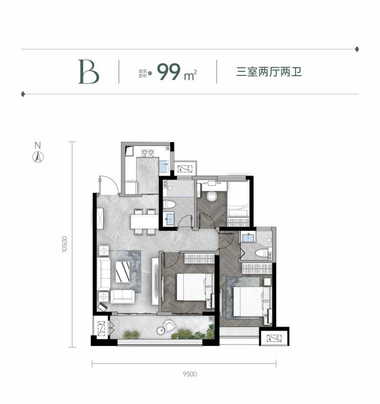 B户型 | 建筑面积约99㎡ | 三室两厅两卫