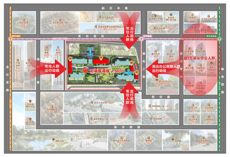 ⊙6栋—航天星苑主出入口·社区车行主入口·24H特色餐饮街区。