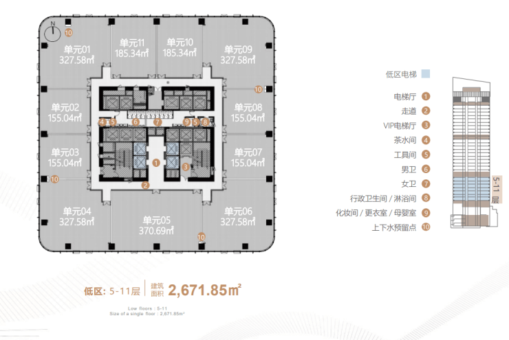 标准层面积:约2670-2884㎡,最小面积150㎡