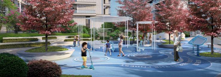 “云”意象主题公园演绎,打造云台漫步、踏云寻鹿、云朵森林三重乐园系统,链接城市云廊慢跑道,围合成公园、商业、住宅三位一体的生活环线。