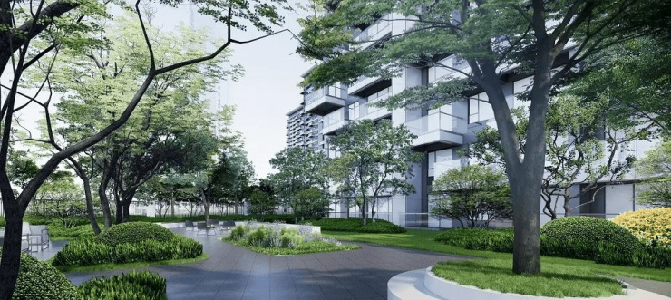 社区内部中轴公园、地上地下绿色情境式商业,仪式归家景观体系、全零段绿意活动区、林下会客花园等多重社群空间体系,缔造一轴一街三境的林下公园漫生活。
