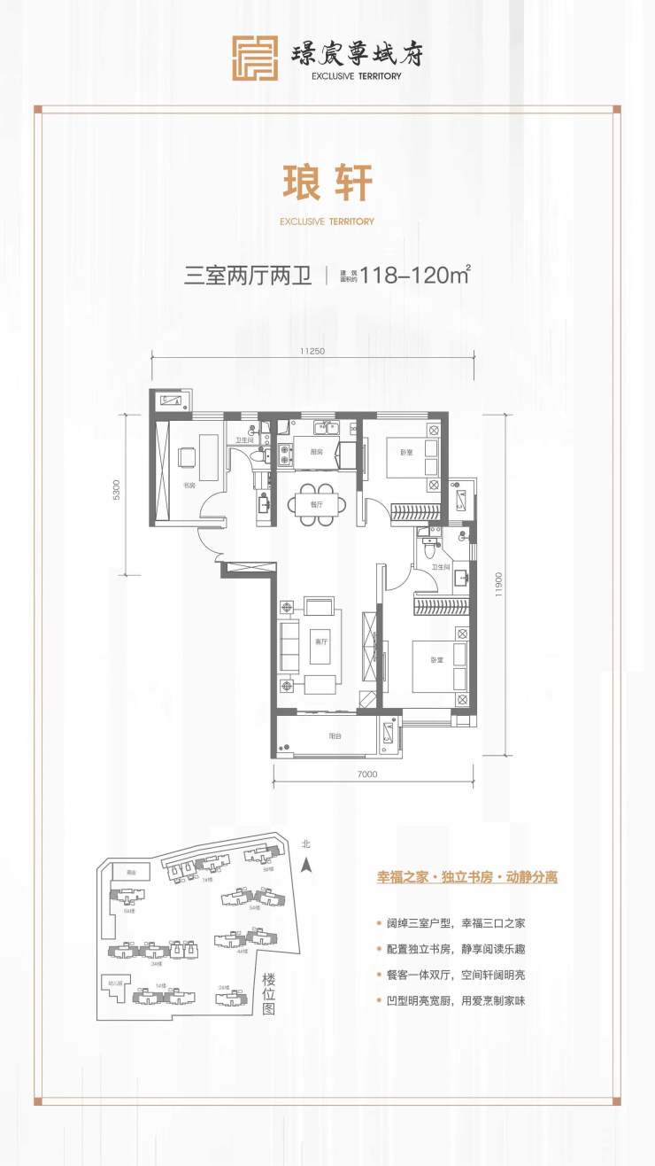 户型3.建筑面积119.36-120.12㎡三室两厅两卫户型64套;