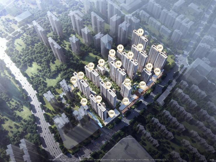 【项目规划】14栋住宅(1#-14#)、3栋商业(15#-17#)、1栋幼儿园(18#-20#)