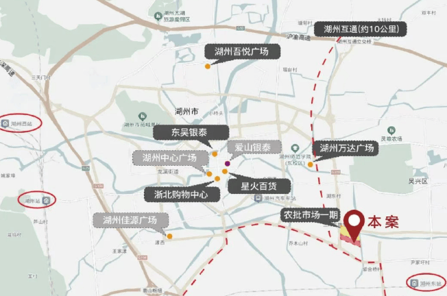 交通配套:项目位于吴兴大道与阿祥路交汇处,交通较为便利。向西沿吴兴大道可达湖州市区,可通达湖州高铁站。距离 318 国道约 3KM、距离 G50 沪渝高速入口直线距离约 4.5KM;距离上海约 120KM、距离杭州约 65KM、距离苏州约 60KM。小区周边公交线路较多,1 公里内有多个公交站点。