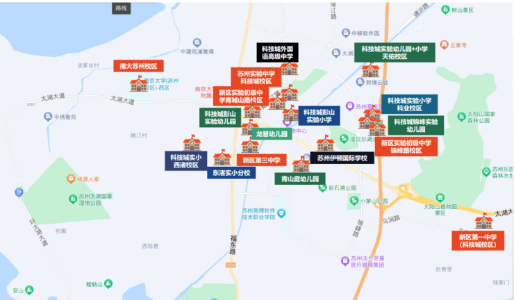 苏州科技城西渚实验幼儿园,苏州科技城实验小学,苏州实验初级中学,高新区第三中学,科技城外国语,南京大学等