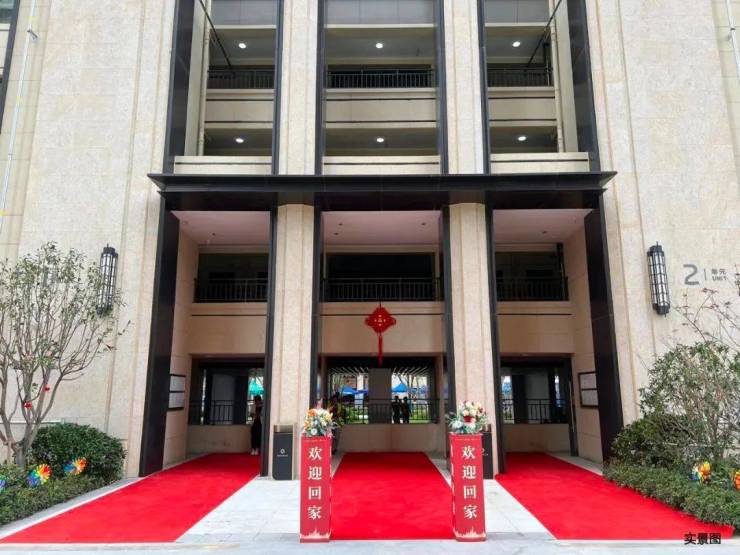 随后我们跟随谷老师一家来到了2#楼进行参观,入户大堂做了挑高设计,十分大气,搭配红地毯、花束、中国结等元素,交房的喜庆氛围拉满。