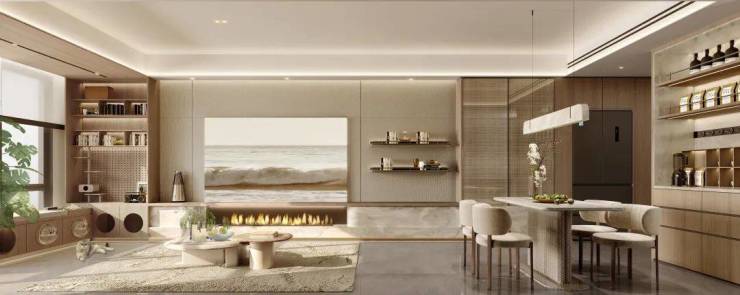 比如门口墙体的凹凸面可打造约5.3㎡(投影面积)的多功能收纳玄关柜,鞋子、雨伞、衣物等统统能收纳;厨房预留了双开门冰箱空间,为家电腾出了更多空间;电视背景收纳柜也留有专属的空间。