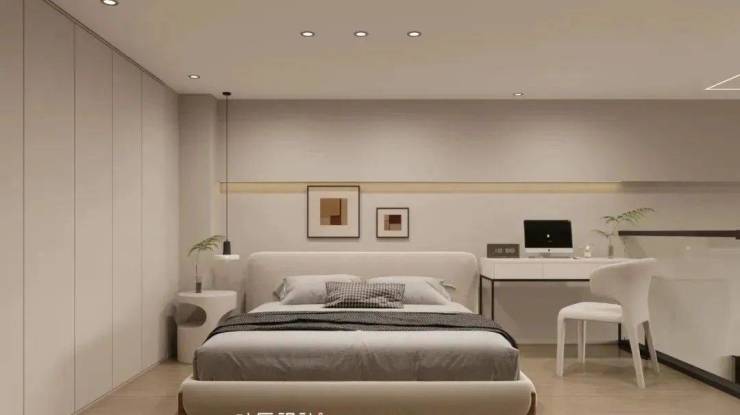 卧室的设计,沿用了整体色调与风格的一致性,通过软装细节的调试,显得整个空间多了一份宁静和放松。床头背后的长城板加硬包,以及墙面的线性灯设计和衣柜的破板设计,都展现出设计,对细节上的把握都非常的精细。