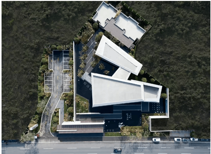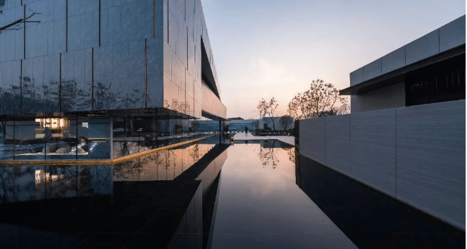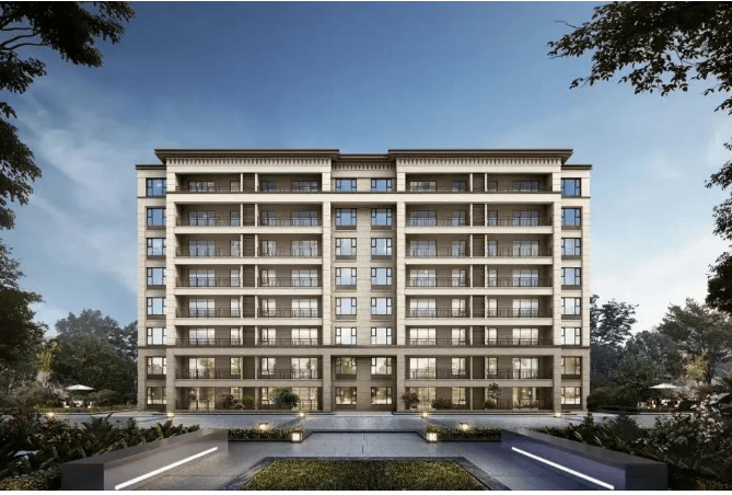 建筑设计:采用现代简约新亚洲风格,立面以米白色为主调,辅以咖色搭配,运用高透玻璃营造光影折射效果,采用真石漆塑造质感肌理,三段式构图,顶部设有挑檐,中部为光影立面,下段是基座,整体建筑色彩明快,精致美观。