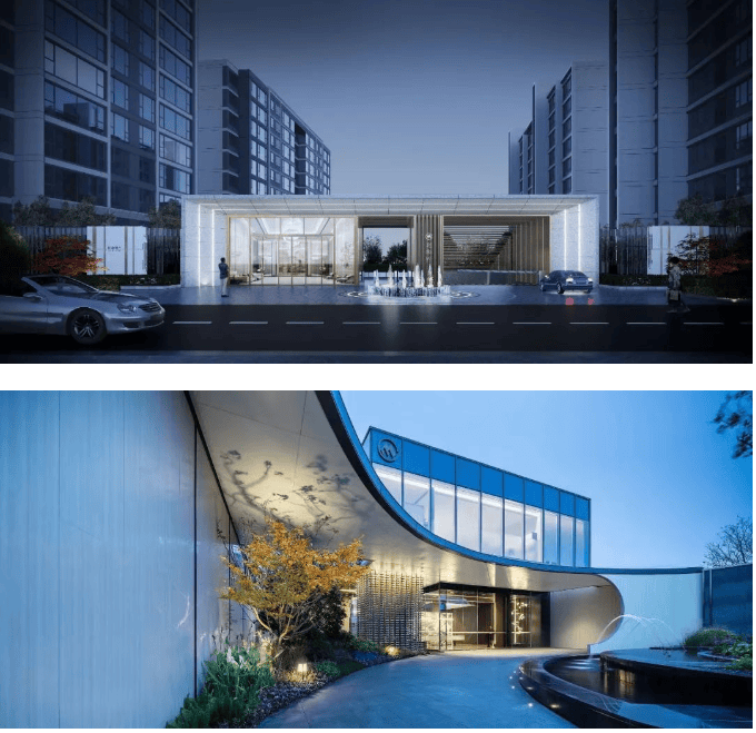 建筑风格:选用保温一体板立面,全封闭阳台 + 超大扇玻璃,勾勒出现代简约的建筑风格,气势恢弘的大门搭配迎宾景墙与潺潺水景,打造出充满尊贵感的迎宾空间。