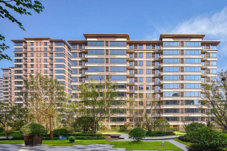 建筑风格现代简约:外立面采用高品质铝板搭配中透 Low-E 玻璃,镶嵌香槟金属线条,展现品质大宅风范。流线型邮轮轮廓元素,简洁的横向曲线,让立面更具灵动感和高级感。实景打造星级酒店式门厅,设置上千平方酒店式落客区,约 6.2 米挑高入户大堂,彰显尊贵身份。