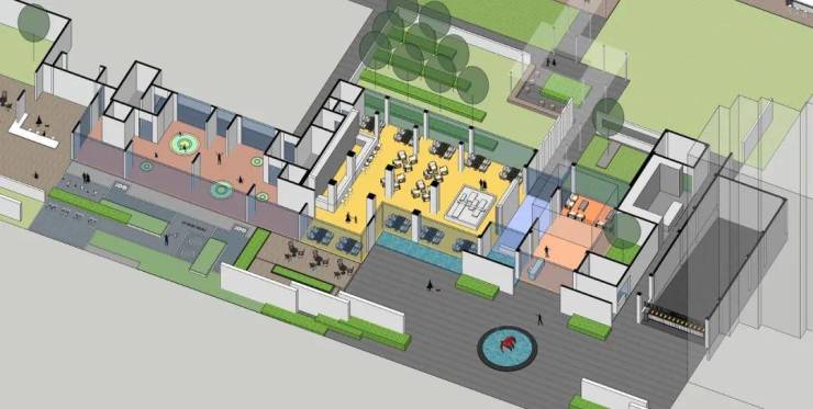 沿街界面结合不同功能分别置入不同个性的盒子模块,并将边缘空间景观化。我们希望以更柔软的表情,让社区和城市的边界是可停留的、丰富性的、自然感的。市民可在此休憩,让建筑成为公园的一部分,也代替了围墙的功能,模糊了社区的边界。