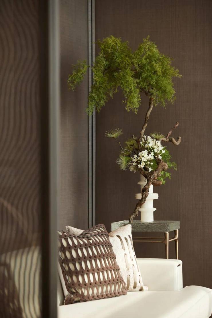 深度洽谈区以经典皮布沙发组合搭配金属“白露”灯装置,刚柔材质碰撞出奢雅质感,渐变光影如雕塑般凝固诗意时光。VIP室运用深色木饰面与压纹皮革背景墙,通过明暗对比强化空间张力,一株苍劲松景以自然线条破局沉稳,点染东方禅意。
