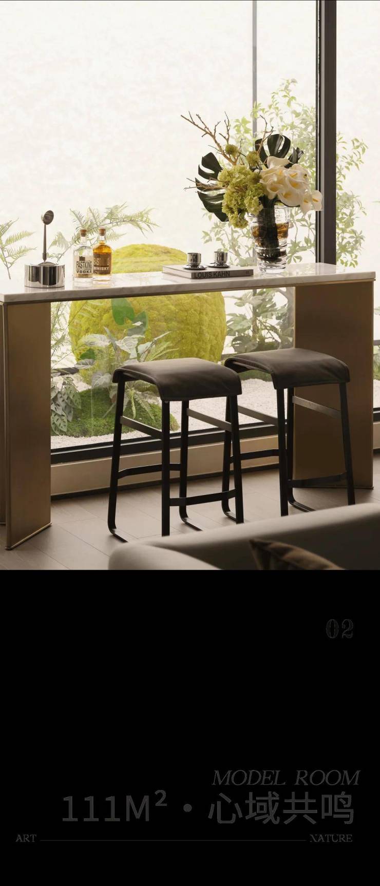 入玄关,艺术灯具与花艺相衬,温暖迎归,强调归家仪式感与归属感。客厅以咖色为主,尽显现代优雅,沙发后设多功能区,满足多元需求。阳台设品茶区,绿植环绕,营造自然宁静氛围,让人身心在茶香绿意中放松治愈。