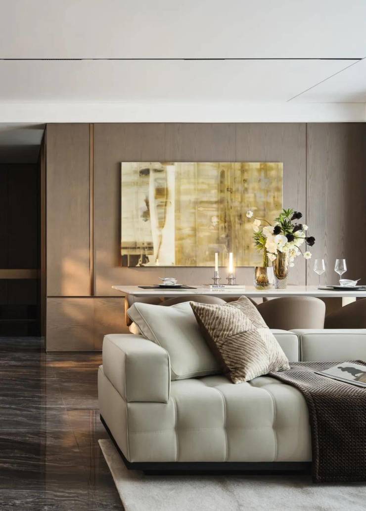 步入客厅,现代意式优雅气息扑面而来。寒江雪岩板作背景主材,融合自然与艺术;空间主要用木质材料,以温润触感平衡冷静调性。咖色为主题色贯穿墙面、软装与灯光,营造沉稳优雅氛围,打造兼具现代感与奢华气质的生活空间。阳台设休息区与工具置放区,兼顾美观与实用。