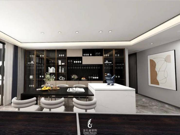 ○ 餐厅背景墙打造一整排柜体,保障公区收纳;