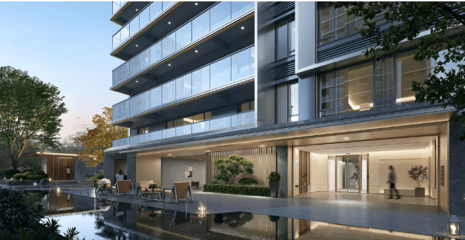 配套设施:主入口采用环岛式落客门庭,“超级树” 造型圆柱,搭配鎏金星空顶、黑色石材地面和水景雕塑,归家仪式感十足。