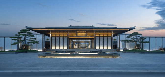建筑风格独特:以宋式美学为蓝本,汲取吕府十三厅规制灵感,创新 “五进归家礼序”。主立面采用木纹铝板与灰白石材交叠,窗墙比达 0.35,结合垂直绿化系统,使能耗较传统建筑降低 40%。