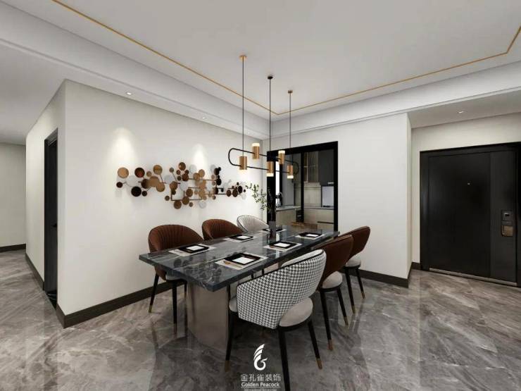 ○ 餐厅背景墙打造一整排柜体,保障公区收纳;