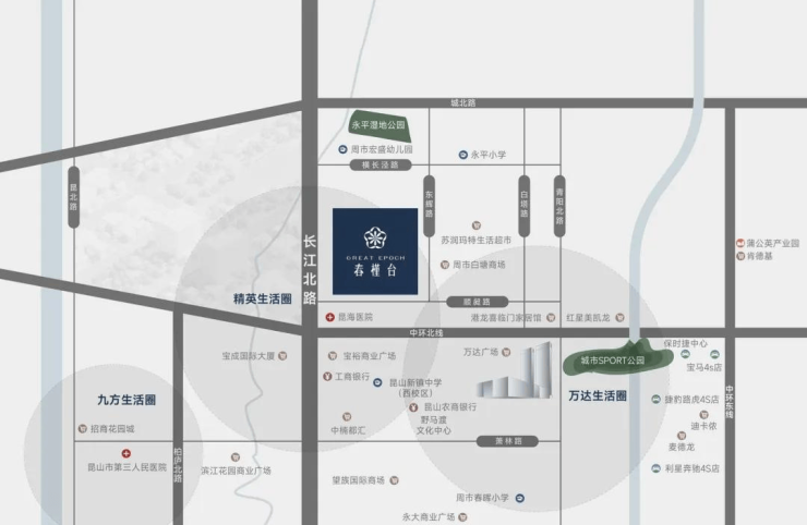 项目南靠中环北线(青阳路、长江路出入口),可快速到达昆山东西南三个方向的城市副中心;距项目1.5公里即是凤凰城商业中心,包含捞王、王品牛排等多个大型餐饮。南向1.8公里即可到达万达广场,满足您一站式的日常购物需求。