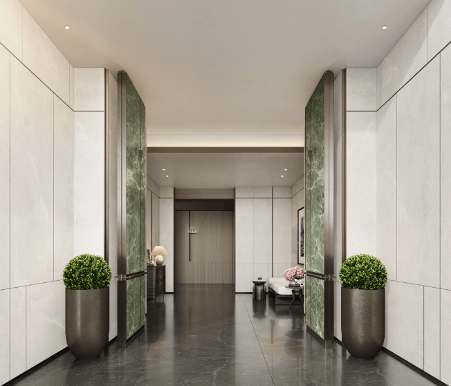 公区设计:小区主入口有五星级酒店同款环岛落客区,40 米长、4-6 米高的归家大门,搭配金属、石材、艺术水景、下沉式卡座、双入户大堂,营造精致归家体验。社区内纯人车分流,地下地上双层精装入户大堂,酒店式门廊,电梯配备单独空调。