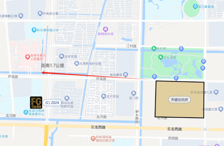 距离苏州市第九人民医院(三乙综合医院)1.7公里,最近的三甲医院可能是吴中太湖新城的市立医院总院。