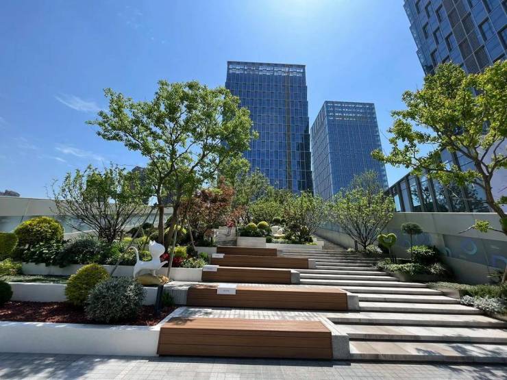 设有黑金沙石材叠水池、樱花步道等景观,复刻江南园林意境。