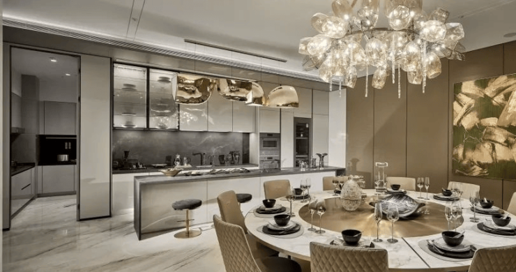 约800平方米的超大空间,中西双厨、独立收藏区、极致会客厅,来自于欧洲奢侈品牌的装甲门、卫浴、厨电设施,无论是有形可创造的建筑,还是蕴藏于空间之中的无形品位,都拥有非同一般的标准。