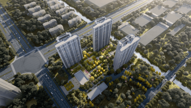 建筑设计:由 3 栋半围合式高层组成,外立面以真石漆进行点缀,同时采用大量玻璃幕墙,扩大楼间距,既呈现了建筑的品质感与美观性,又保证了良好的采光。